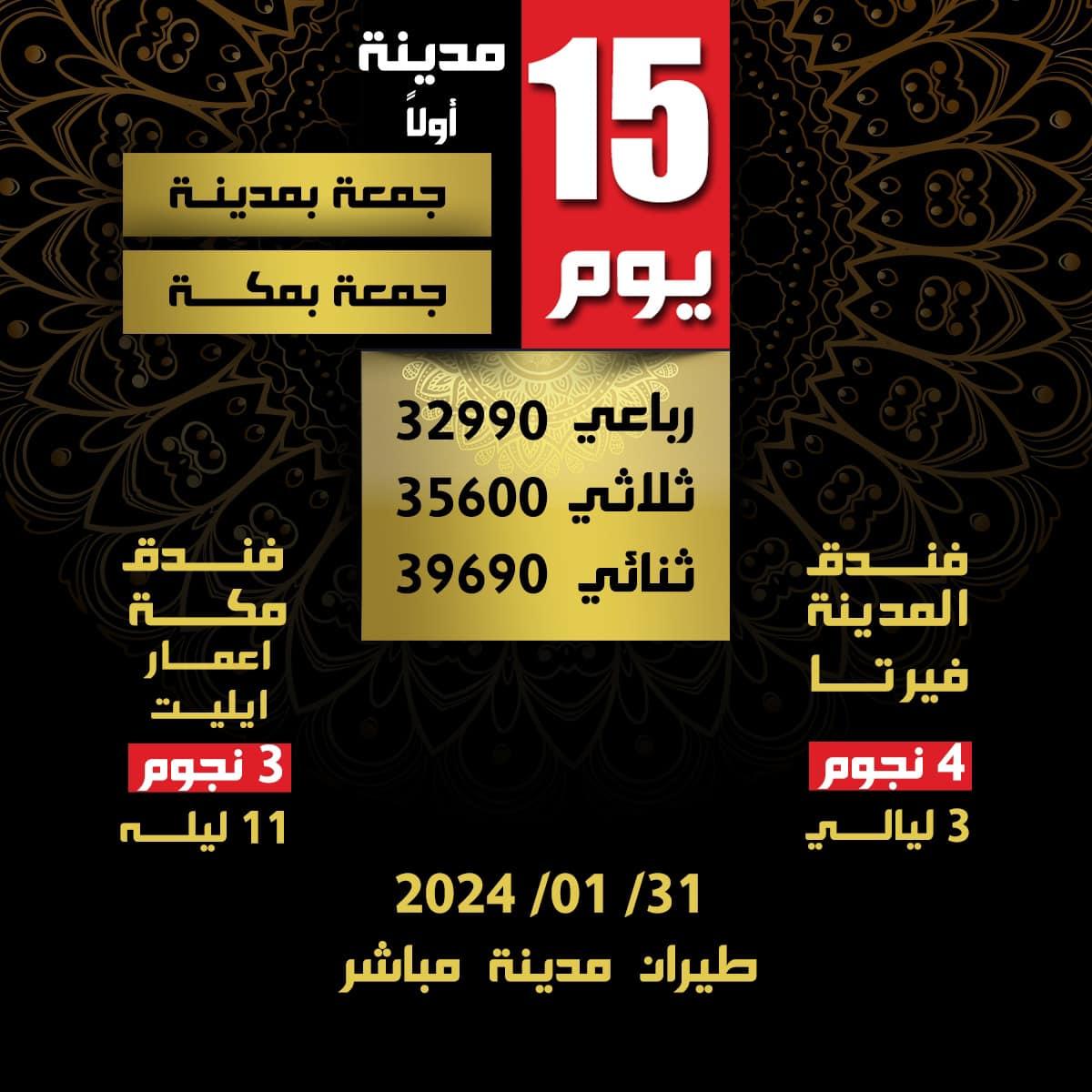 تفادياً لتقلبات سعر صرف الريال، يُرجى دفع كامل القيمة عند الحجز. تم احتساب سعر تذكرة الطيران: ذهاب مدينة مباشر 17000 وفقا للسعر المتوقع ويتم تحديث سعر التذكرة بالزيادة او النقصان وفقاً لأي مستجدات